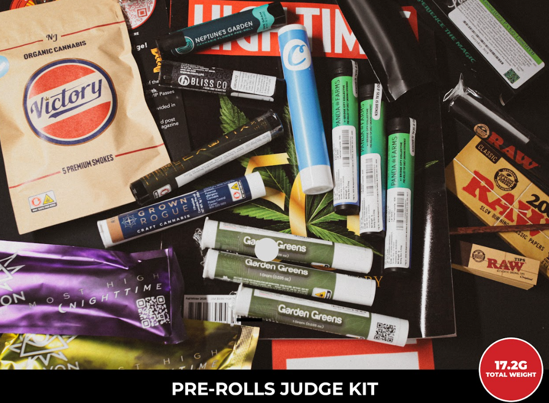 The Pre-Roll entries include a variety of options from multiple growers, such as Blood Orange by Agri-Kind (1G), Gruntz Joint by Bliss Co (0.7G), Lemon Sportiff and Mule Fuel by Elyon Cannabis (each 1.25G), Fruit Stand, Big Apple, and Z by Garden Greens LLC (each 1G), Garden State Exotix – Supper Zkittlez 1g Blunt by Garden State Exotix (1G), Loosie by Magic Garden Botanicals (1G), Lemon Ice Cream by Neptune’s Garden (1G), SUPER BOOF 1g Preroll, BLUE ZUSHI 1g Preroll, and GMO Root Beer 1g Preroll by Panda Farms (each 1G), Cookies Hollywood Pre-Roll | 1g by TerrAscend (1G), and Sour Blueberry Smokes by Victory Natural Farms (3G). In addition, the package includes judge gear and accessories such as a High Times tote bag, the High Times 50th Anniversary Magazine, a High Times sticker, and a selection of RAW and Elements accessories including papers, tips, a lighter, a magnifying card, an ashtray, and more.