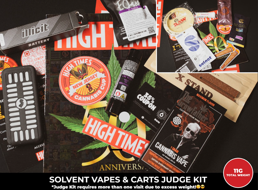 The solvent vape entries include Mochi (LIVE) – 1.0g (T PRO) by Fernway (1G), Select Essentials Briq – Electric Green Apple by Grassroots (2G), 201 Live by Hera Solutions (1G), Violet Fog by Illicit (1G), Boardwalk Bliss 1g Cartridge by Jersey Smooth (1G), The Clear Grapevine All-In-One by Kushi Labs (0.5G), 1g (S/H) Tropicana Cookies x Orange Creamsicle Cryo Liquid Diamond Disposable by Little Leaf Labs (1G), Z – Indica by Magic Garden Botanicals (1G), 0.5g Live Resin All-In-One Garlic Jam by North Lake Supply (0.5G), Budder Cartridge Colin OG by Pyramid (0.5G), Pomegranate Lime by Sun Extractions (0.5G), and Legend Live Terpene All-In-One Disposable Permanent Marker by TerrAscend (1G). Judge gear and accessories include a High Times tote bag, High Times 50th Anniversary magazine, High Times sticker, and RAW & Elements accessories such as papers, tips, a lighter, an ashtray, and more.