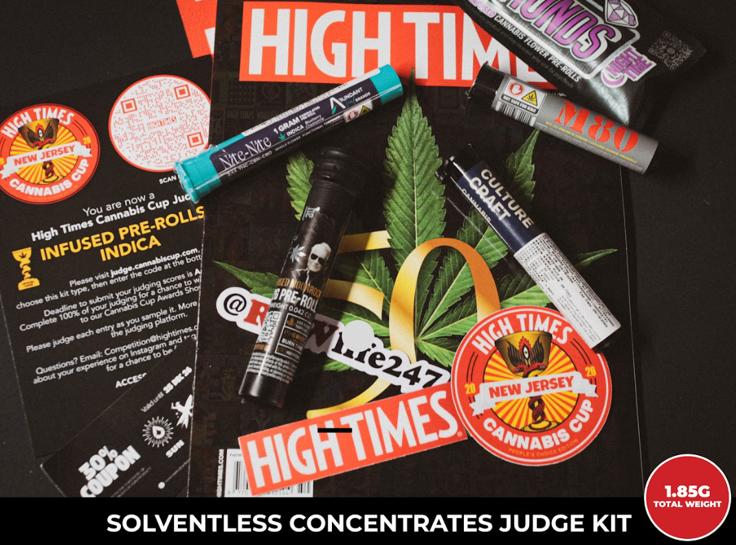 The Solventless Concentrates entries feature a refined selection of products including Call Me Zaddy and BobHope Rosin by Culture Craft (each 0.3G), Screw Face Live Resin Badder and Super Lemon Haze Live Resin Badder by Sun Extractions (each 0.5G), and Maple Nectar Live Rosin Cold Cure by Sussex Cultivation (0.25G). In addition, the package includes judge gear and accessories such as a High Times tote bag, the High Times 50th Anniversary Magazine, High Times stickers, and a selection of RAW and Elements accessories including papers, tips, a lighter, an ashtray, and more.