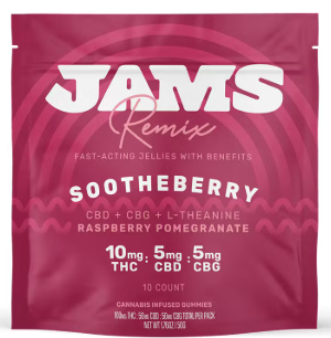 10 pieces | Ratio: 10mg THC : 5mg CBD : 5mg CBG per pieceLevel up how you wind down with the calming qualities of Sootheberry Remix Fast-Acting Jellies. The harmonious blend of CBD, CBG, and L-Theanine balances mellow vibes with a deliciously bold raspberry pomegranate flavor. Kick back and stack up the smiles with Sootheberry.