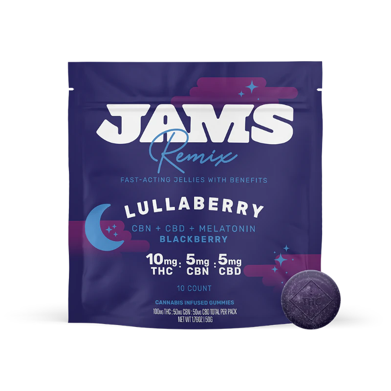 Turn up the flavor and turn down the lights - JAMS Remix Lullaberry Fast-Acting Jellies with Benefits usher you to dreamland. These specially designed jellies help you sink into bed with the stacked benefits from THC, CBN, CBD and Melatonin. For best results, pair Lullaberry with cool, fluffy pillows and a night light.
