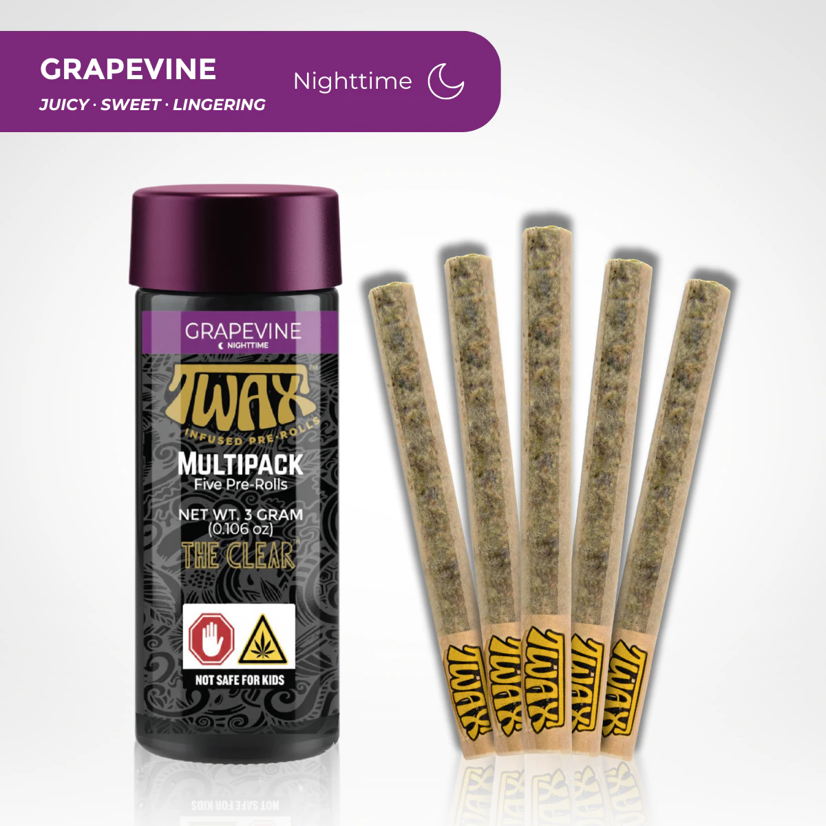Craving that juicy, sweet grape flavor that lingers on your taste buds? Our Grapevine TWAX infused pre-roll delivers a delightful and flavorful experience. Savor every hit and let the rich grape essence transport you to pure enjoyment. Known for a calming, sleepy high, it's the perfect companion for unwinding after a long day.