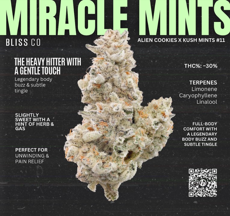 Miracle Mints is a smooth, well-balanced hybrid with refreshing minty notes and subtle sweetness. It wraps you in full-body comfort and gentle tingles without clouding your