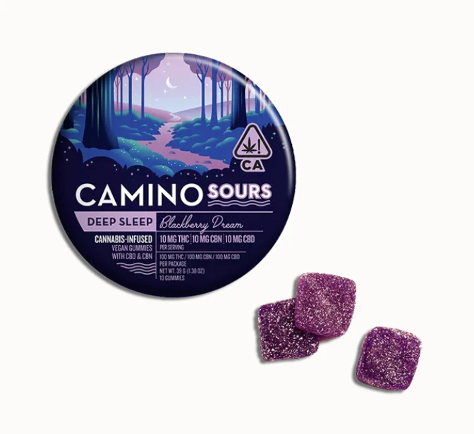 You know that feeling when your mind is racing, and the demands of the day refuse to loosen their grip and let you fall asleep? That's when you reach for Blackberry Dream Deep Sleep Camino Sours vegan gummies. Each sweet blackberry gummy is dusted in sour sugar and contains a tailored blend of 10mg THC, 10mg CBD, and 10mg CBN along with chamomile and lavender extracts plus indica-like terpenes to create a state of serene slumber. CBD, celebrated for its subtle, soothing qualities, creates a gently euphoric experience that helps the body unwind. CBN, especially when combined with THC, is often appreciated for its ability to create a sense of calm and tranquility. The enchanting blackberry flavor adds a touch of sweet, fruity indulgence to your nightly ritual, setting the stage for a soothing bedtime routine. These gummies aren't just a delightful treat; they help promote a powerfully tranquil night and a revitalized wake up so you can conquer the day ahead. Terpenes: Beta-Caryophyllene, Linalool, Myrcene
