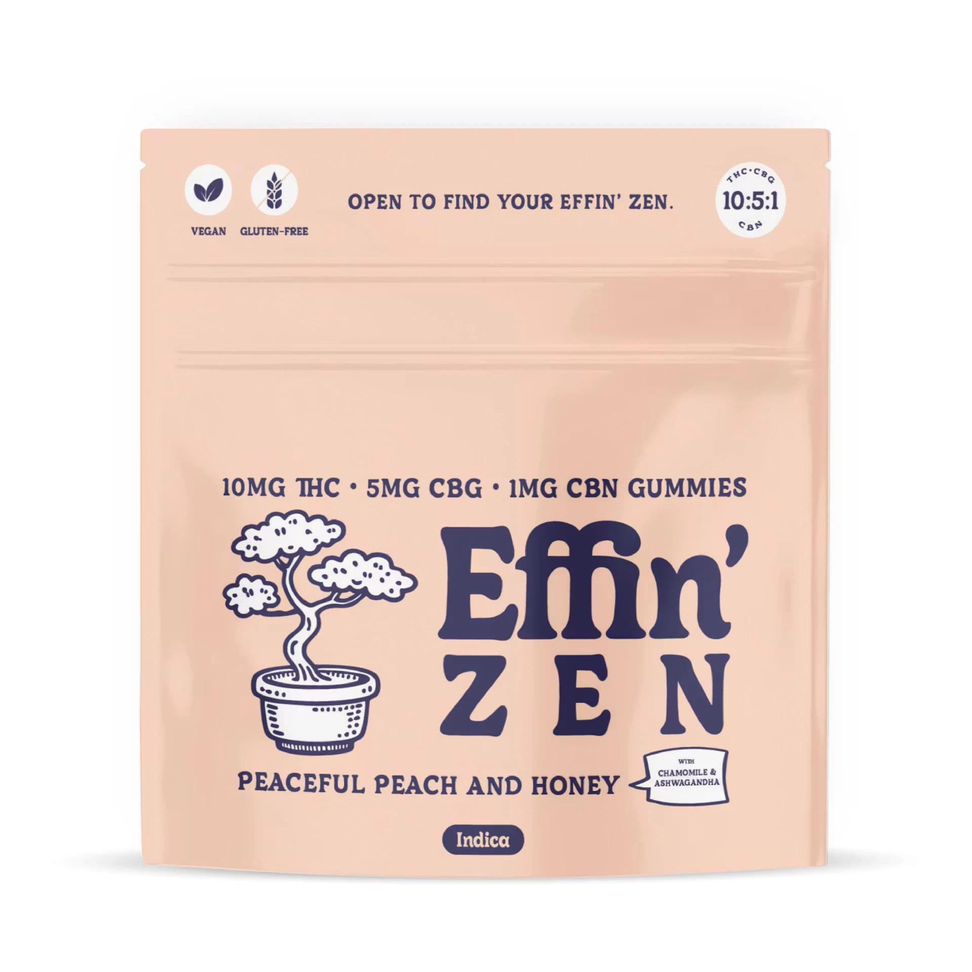 Effin' Zen. Burned out? Time to check out. Let Effin' Zen wisp you away to a happy place. Packed with THC, CBG, and CBN, these Peach & Honey treats will remind you of peach and tranquility. Specially infused with Chamomile to help sooth the mind and Ashwagandha to keep you balanced.