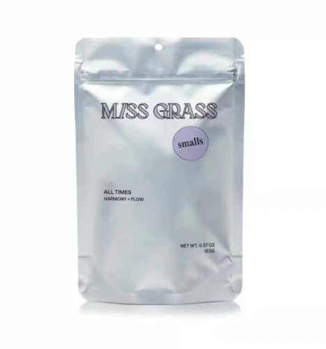 Miss Grass All Times Grape Kush Smalls is a balanced hybrid cannabis product sold in a 10.5g resealable pouch. Part of the "All Times" line, it is curated for a "Harmony + Flow" experience, offering versatile effects that balance physical relaxation with mental clarity.