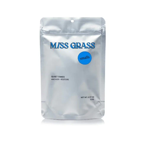 Miss Grass Quiet Times Sour Smalls is an indica-dominant cannabis flower sold in a 10.5g resealable pouch. As part of the "Quiet Times" line, it is specifically curated for an "Anchor + Restore" experience, focusing on relaxation and physical comfort.
