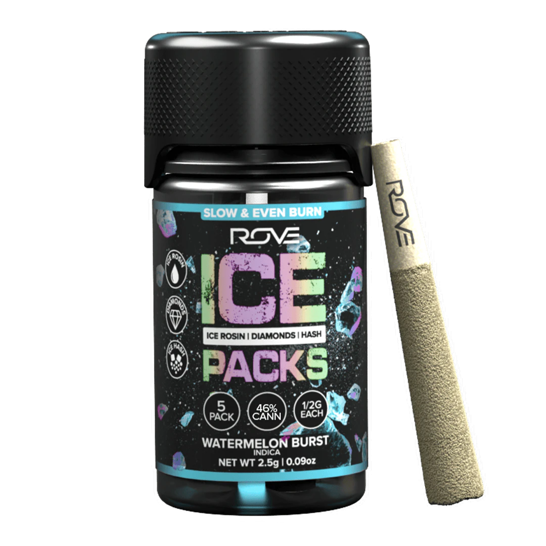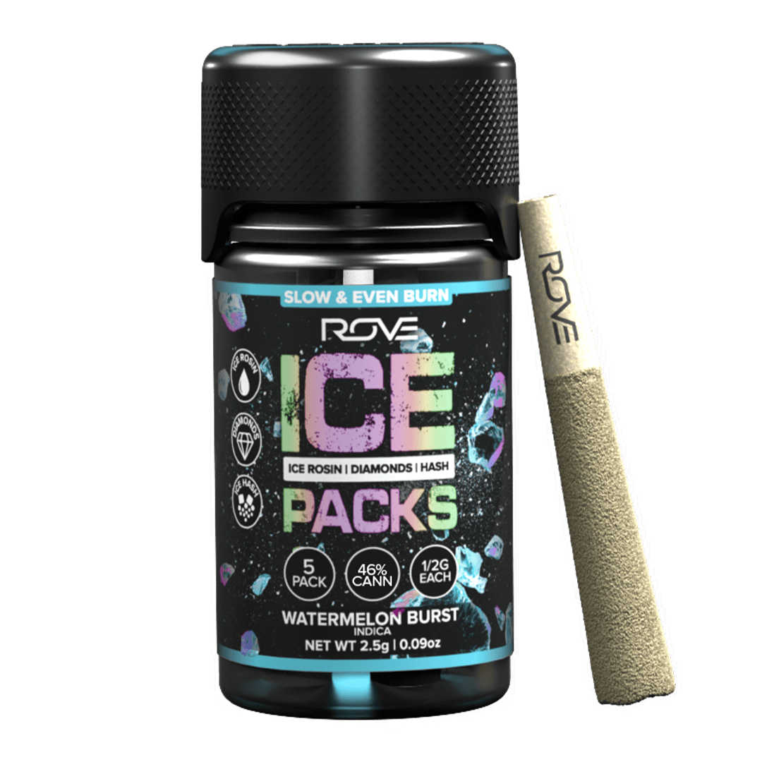 Rove Ice Packs, the world’s first triple-infused preroll. Made with premium-grade flower fully-infused with THCA diamonds and solventless ice hash rosin, they're expertly rolled, then coated with more ice hash. Super smooth and ultra potent, Rove Ice Packs test at over 50% THC. Welcome to the next evolution of prerolls.