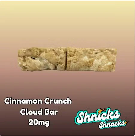 The Cinnamon Crunch Cloud Bar from Shnicks Shnacks is a handcrafted edible that delivers a comforting blend of classic cinnamon roll and marshmallow cereal treat flavors, infused with 10mg of THC for an enjoyable, mellow experience. Each bar features gooey marshmallow binding warm cinnamon spice cereal, offering a sweet and spicy crunch in every bite. The flavor profile leans on a nostalgic cinnamon cereal note, complemented by subtle sweetness and a touch of crispy texture, making it especially appealing for those with a sweet tooth or fond memories of breakfast bars.