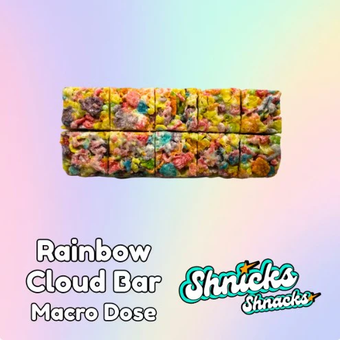 The Rainbow Cloud Macro Bar is a mix of fruity cereal and melted marshmallow (infused with Shacks Liquid Gold). It all began here, with a colorful crunch and a burst of fruity flavor that started the Shnicks Shnacks journey. The Shnicks Shnacks team has hand crafted every edible with love to deliver a nostalgic crunch, rich flavor, and a reliable high. It’s your favorite childhood treat, all grown up.